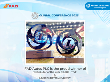 At the Ashok Leyland Global Conference 2025, IFAD Autos PLC. earned remarkable recognition with two prestigious honors: Distributor of the Year (10,000+ TIV Category) and the Leyparts Revenue Growth Award.